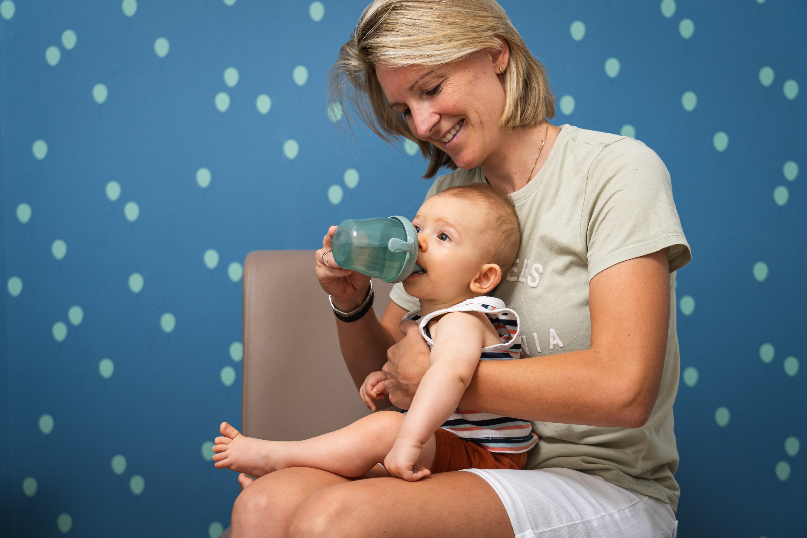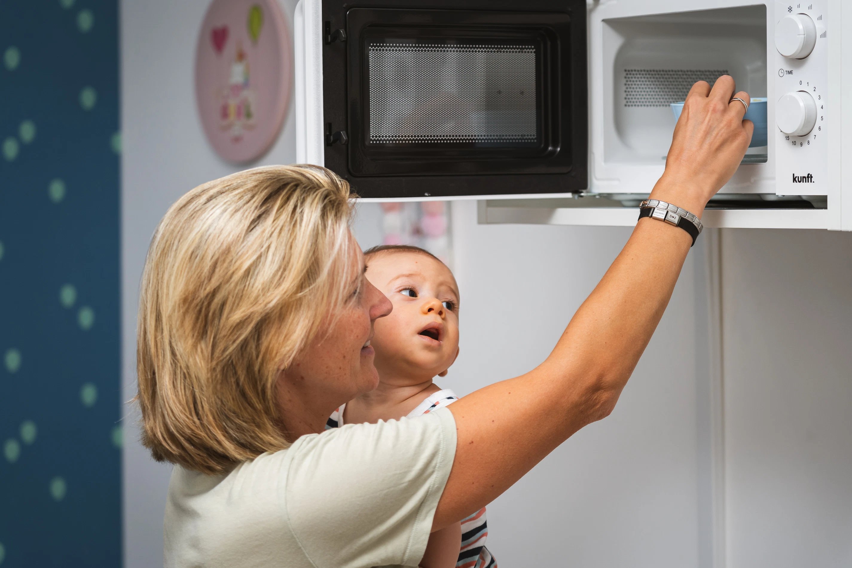 Er verfügt über Babynahrung (Joghurt, Obstbeutel, Brei, Milch, Kekse), Stühle zum Füttern, Kinderspielzeug, Stillecke, Kühlschrank, Mikrowelle, Zauberstab und Wasserkocher.